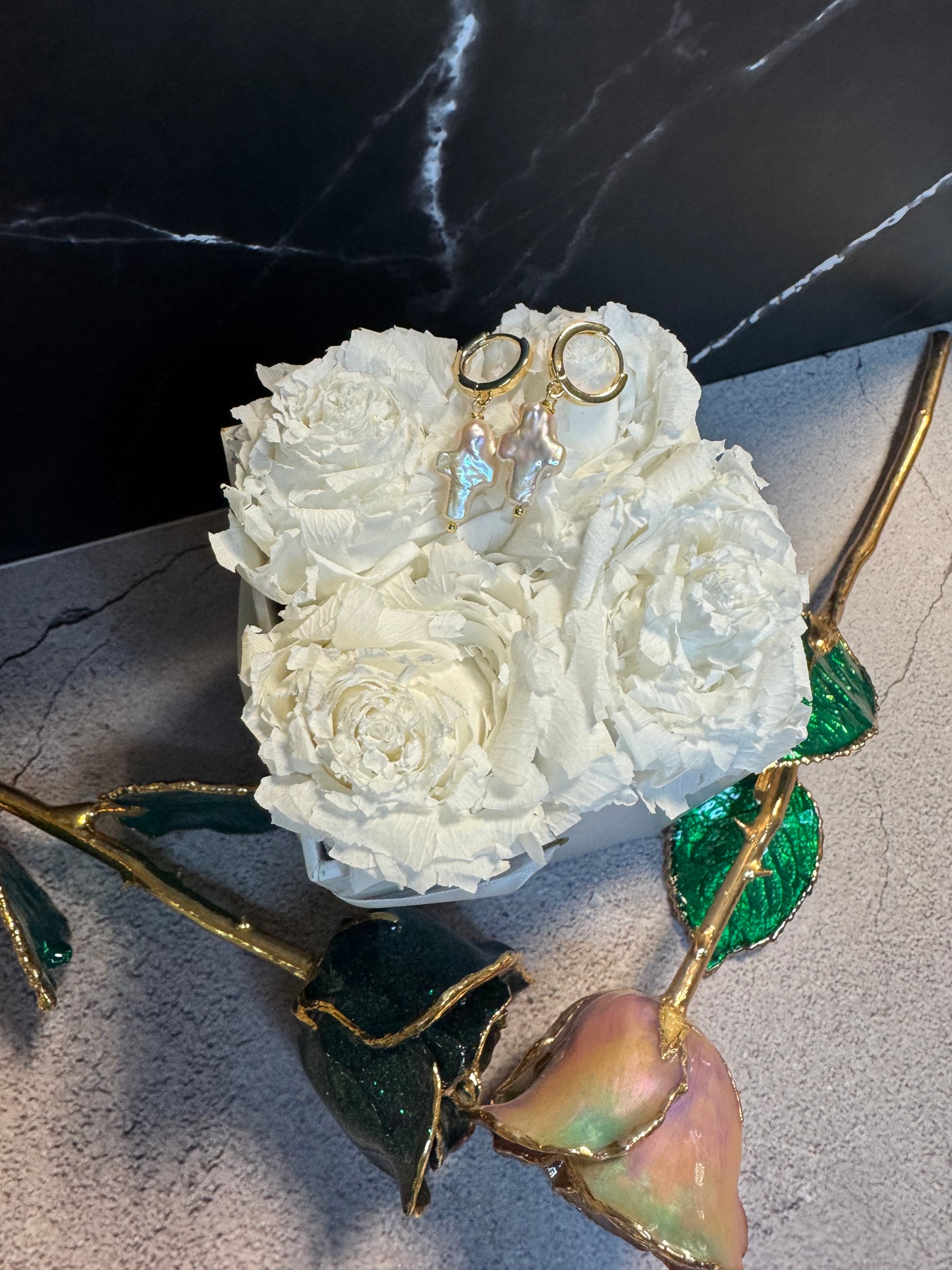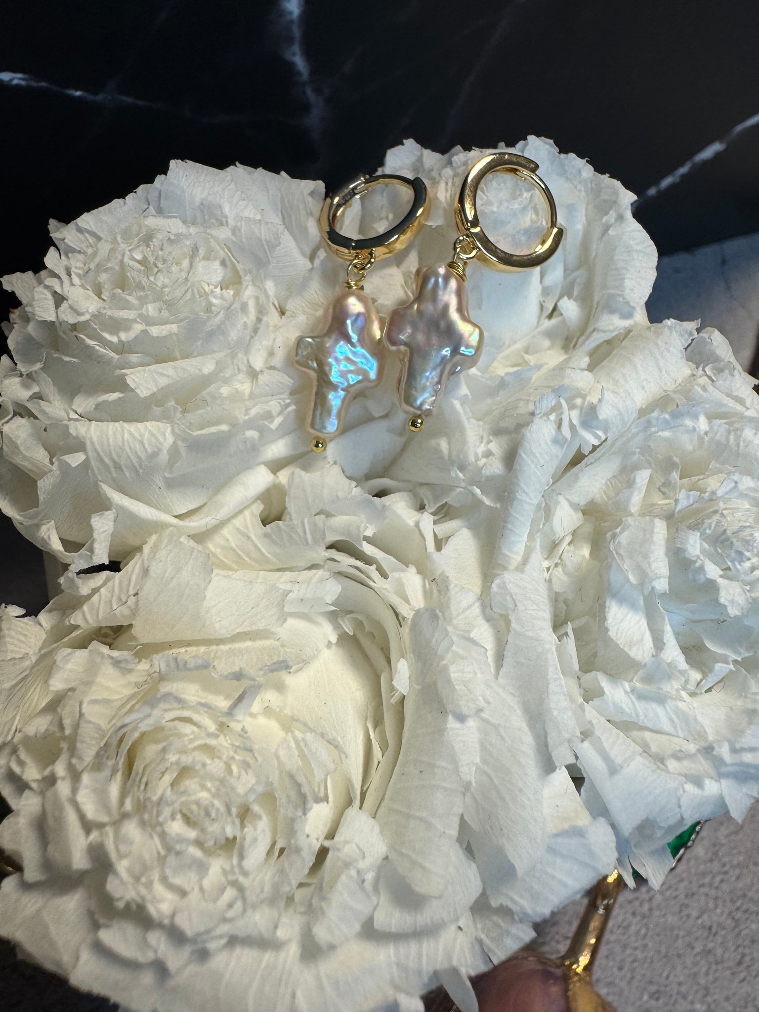 These earrings pair baroque freshwater pearls with sterling silver and gold plated posts for a modern cross design. Each unique pearl is handpicked to highlight its irregular shape.