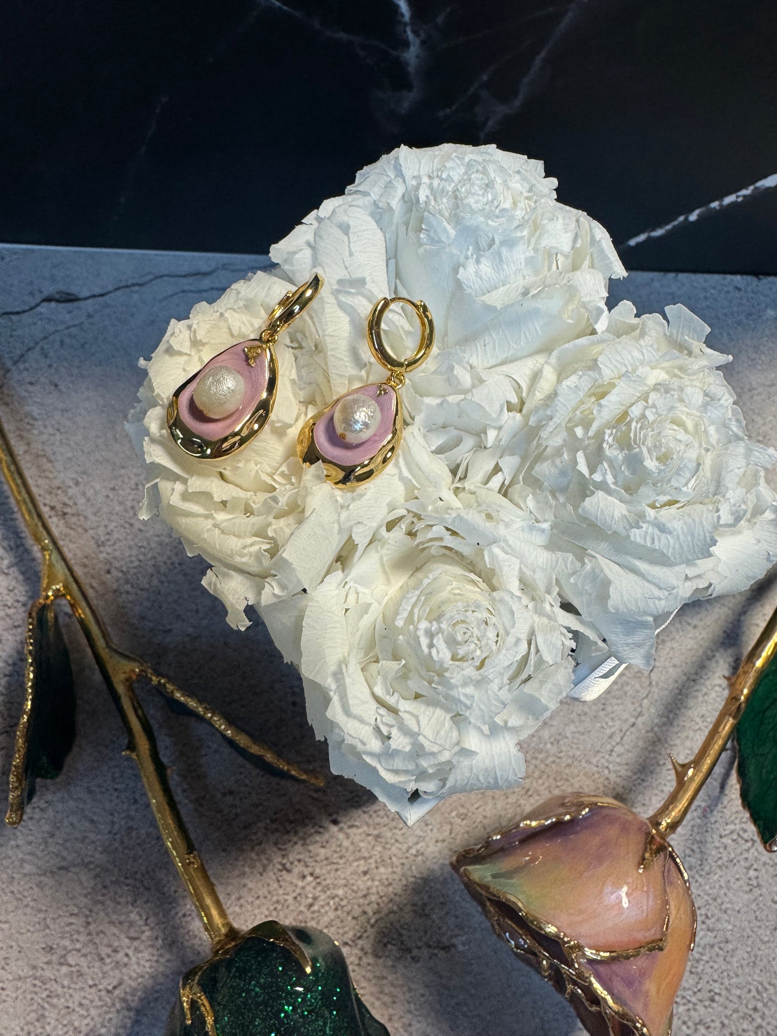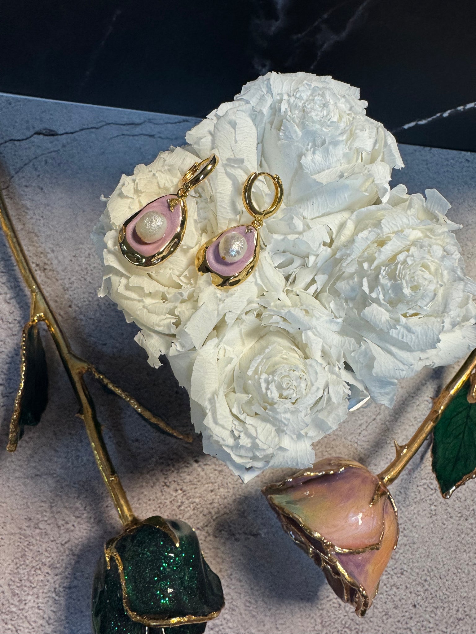 earrings feature lilac enamel and freshwater pearls.