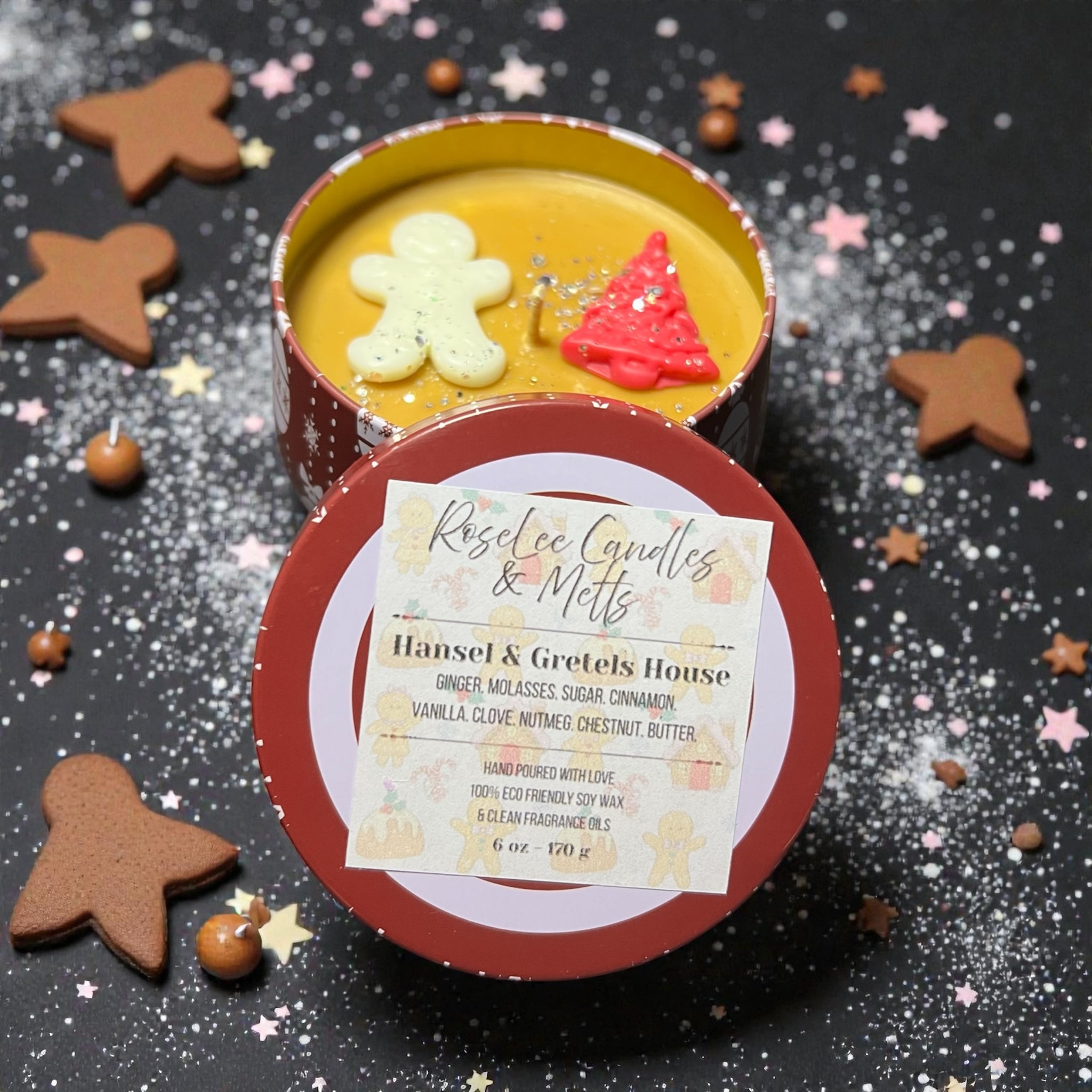 Top notes of a light citrus and delicious ginger, leads you to the hearty middle notes of cinnamon, molasses and sugar. Finished off with the base notes of nutmeg, chestnut, and butter. This candle is topped with an adorable assortment of mini Christmas melts (brown, red, or white). Due to each candle being hand poured individually no two candles will look exactly alike. We top it all off with sparkles!