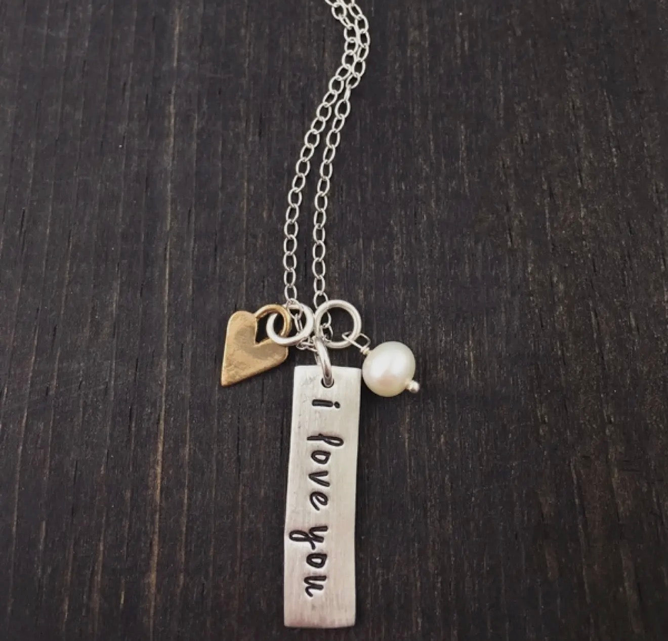 Hand created charm in fine pewter hung with a freshwater pearl on an 18" plated link chain.