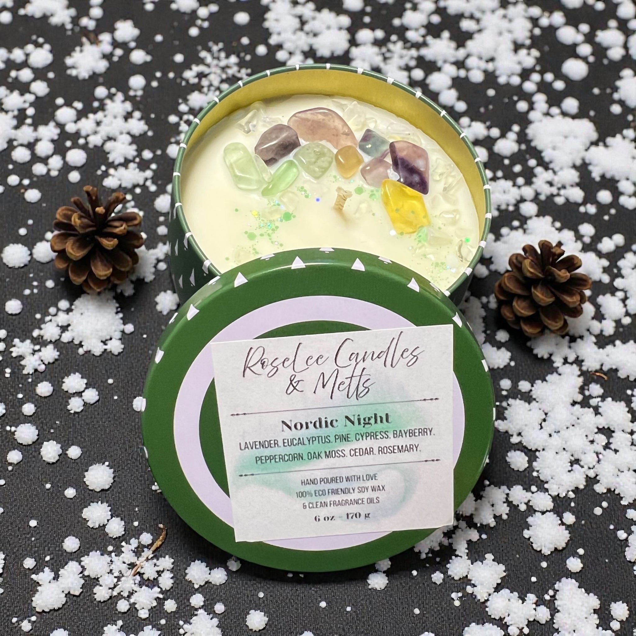 Calling all crystal lovers! This candle is topped with Fluorite, Opal, Amethyst, and Aventurine. Imagine yourself in a silent snow covered pine forest with artic winds whipping through your minds and taking the biggest breath of fresh air you could get! NordicΒ Night centers the night chill with top notes of eucalyptus and lavender. Pine holds the middle note strong while it rests on an herbal woodsy base of cedar and oak moss.
